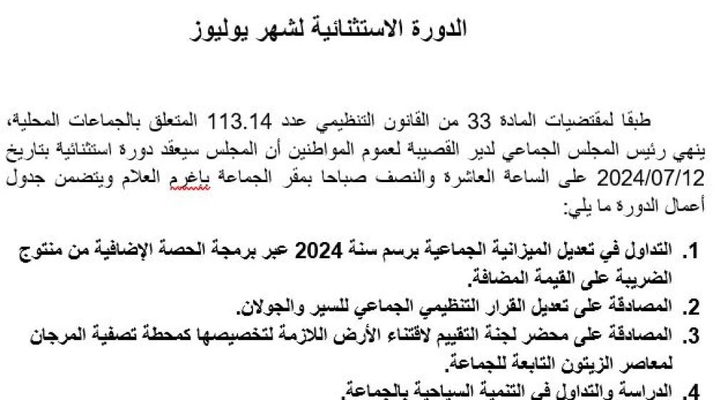 طبقا لمقتضيات المادة 33 من القانون التنظيمي عدد 113.14 المتعلق بالجماعات المحلية، ينهي رئيس المجلس الجماعي لدير القصيبة لعموم المواطنين أن المجلس سيعقد دورة استثنائية بتاريخ 12/07/2024 على الساعة العاشرة والنصف صباحا بمقر الجماعة بإغرم العلام ويتضمن جدول أعمال الدورة ما يلي: التداول في تعديل الميزانية الجماعية برسم سنة 2024 عبر برمجة الحصة الإضافية من منتوج الضريبة على القيمة المضافة. المص ...